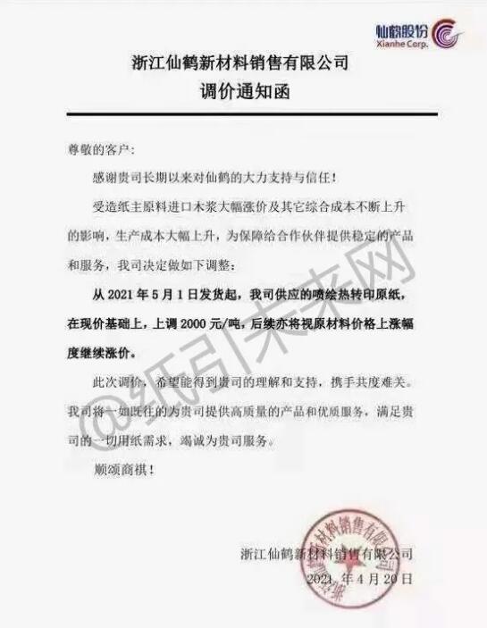 浙江仙鶴新材料銷售有限公司:受造紙主原料進(jìn)口木漿大幅漲價(jià)及其它綜合成本不斷上升? 的影響,生產(chǎn)成本大幅上升,為保障給合作伙伴提供穩(wěn)定的產(chǎn)品? 和服務(wù),我司決定做如下調(diào)整;? 從2021年5月1日發(fā)貨起,我司供應(yīng)的噴繪熱轉(zhuǎn)印原紙,? 在現(xiàn)價(jià)基礎(chǔ)上,上調(diào)2000元/噸,后續(xù)亦將視原材料價(jià)格上漲幅度繼續(xù)漲價(jià)。