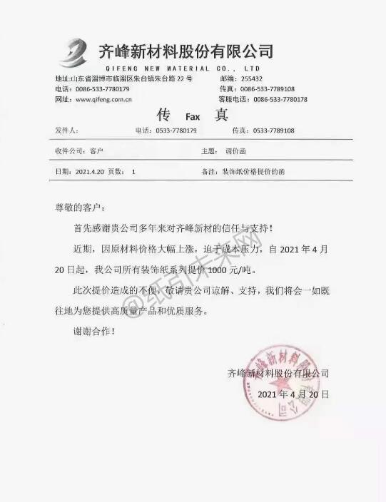 齊峰新材料股份有限公司:因原材料價(jià)格大幅上漲,迫于成本壓力,自2021年4月? 20日起,我公司所有裝飾紙系列提價(jià)1000元/噸。