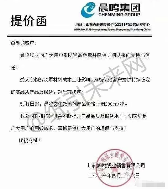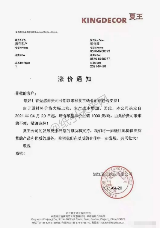 浙江夏王紙業(yè)有限公司:由于原材料價(jià)格大幅上漲,生產(chǎn)成本增加。因此,本公司決定自2021年4月20日起,所有紙型單價(jià)上調(diào)1000元/噸。