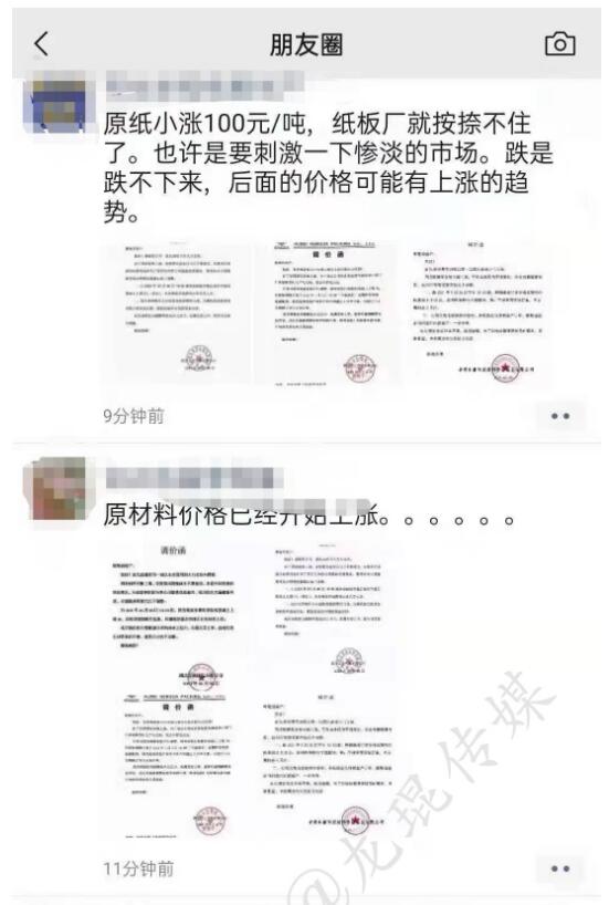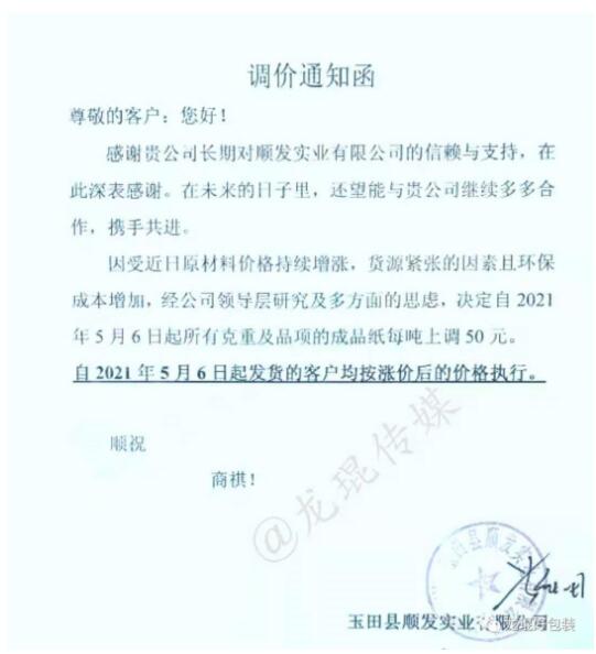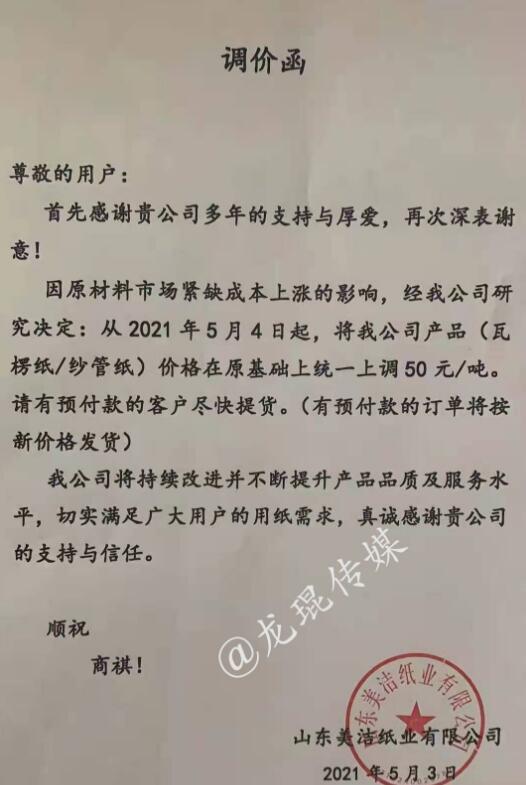 5月6日,假期正式結(jié)束,玖龍紙業(yè)多個(gè)基地逐步取消前期優(yōu)惠。同時(shí),全國各地宣布漲價(jià)的紙廠陸續(xù)增多,部分紙廠甚至要求原有未完成的已接訂單也在漲價(jià)范圍內(nèi)。從公開可見的漲價(jià)函中可以看到,紙廠普遍表示,原材料價(jià)格上調(diào)以及環(huán)保因素是漲價(jià)的主要原因。