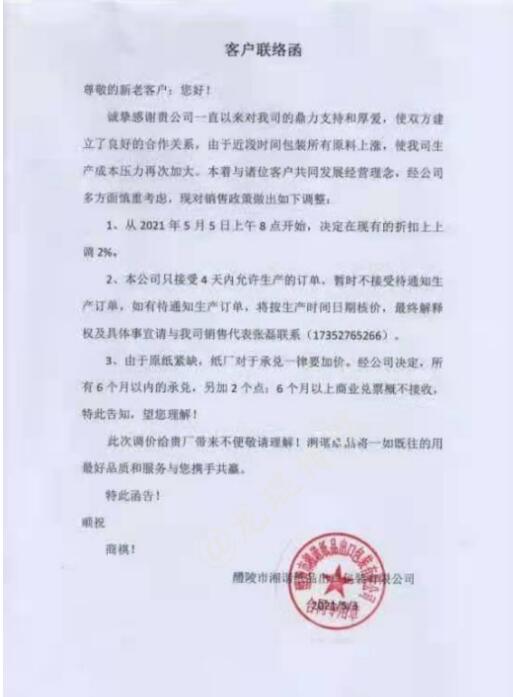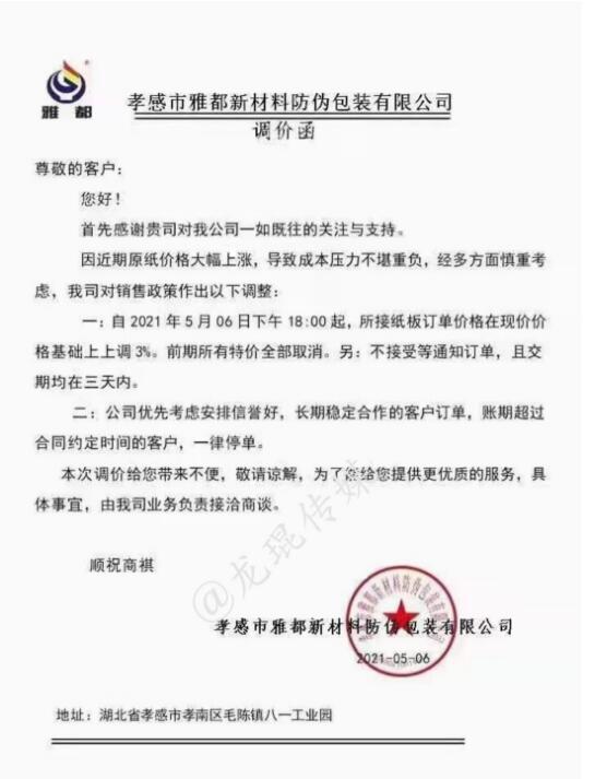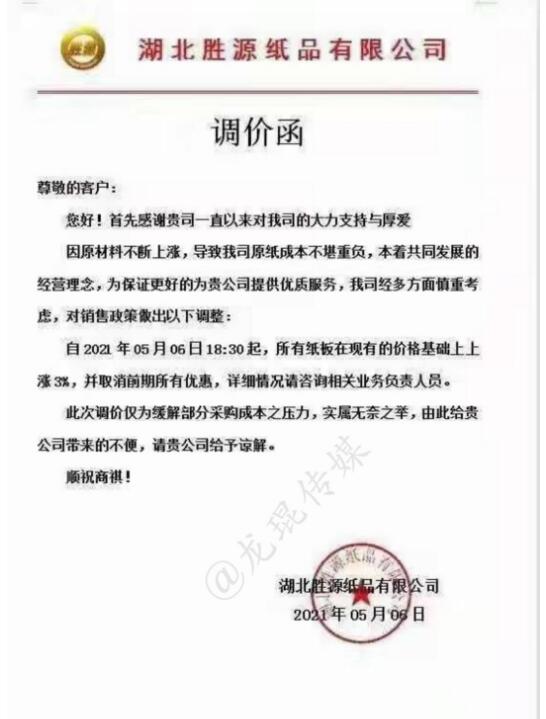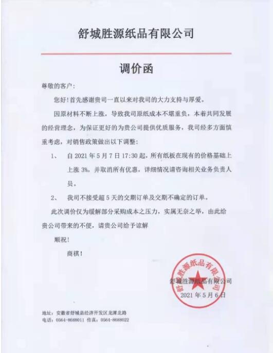 從5月7日17點(diǎn)半開始,所有紙板在現(xiàn)有的價(jià)格基礎(chǔ)上上漲3%,并取消所有優(yōu)惠。