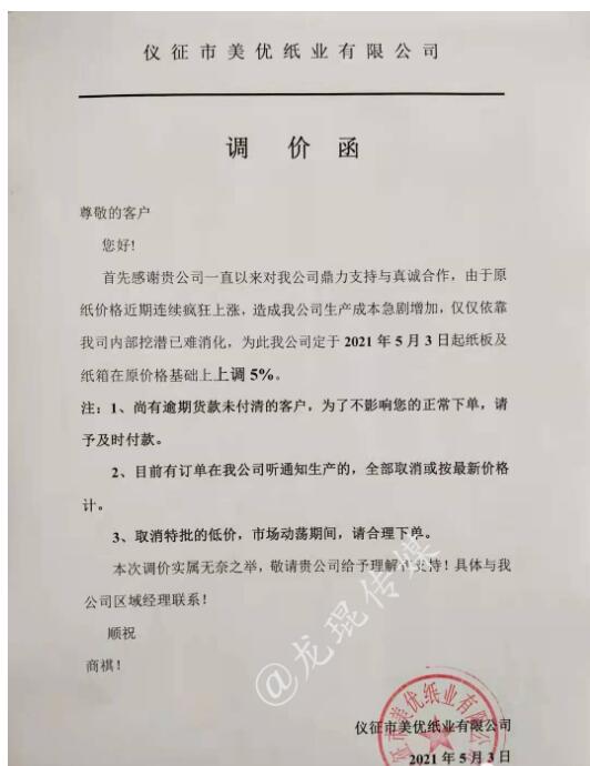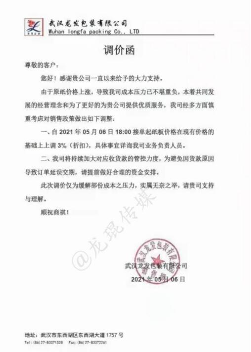 從2021年5月3日起,紙板及紙箱在原價(jià)格基礎(chǔ)上上調(diào)5%。