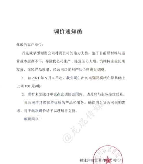 從2021年5月6日起,公司生產(chǎn)的高強(qiáng)瓦楞紙?jiān)谠A(chǔ)上漲100元/噸。
