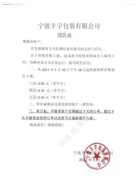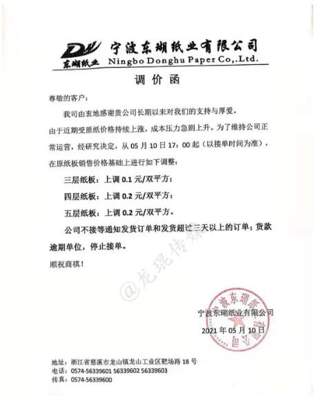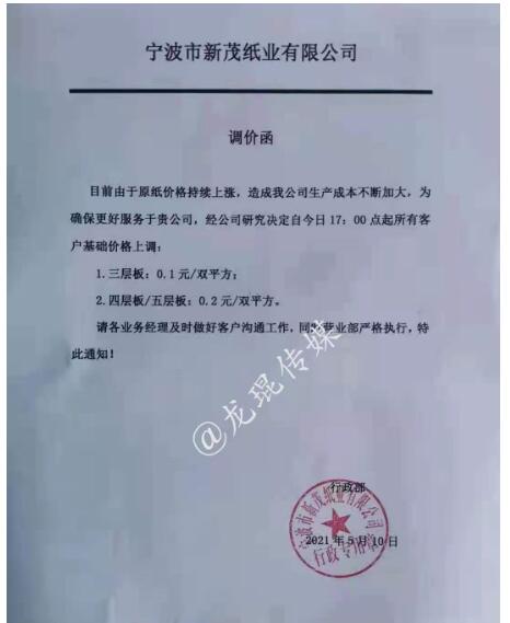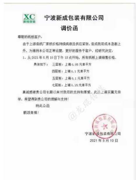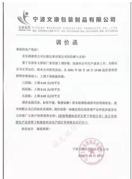 從2021年5月10日18點起,三層紙板上漲0.05元/單平方,四層紙板上漲0.10元/單平方,五層紙板上漲0.10元/單平方。