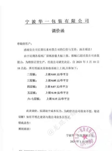 從2021年5月11日8點開始,三層板上漲0.10元/雙平方,四五層板上漲0.20元/雙平方,六七層板上漲0.30元/雙平方,特殊楞型(EA瓦)以及覆膜紙上漲0.30元/雙平方。