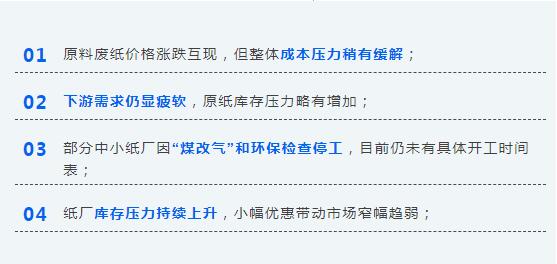 本周瓦楞紙、箱板紙市場價格大勢維穩運行。規模紙廠多數持穩運行,個別紙廠實單成交略有優惠,整體出貨情況一般,廣東地區受“煤改氣”影響,產量供應較前期有很大程度的縮減,瓦楞紙價格普遍實單優惠,幅度在50-100元/噸。