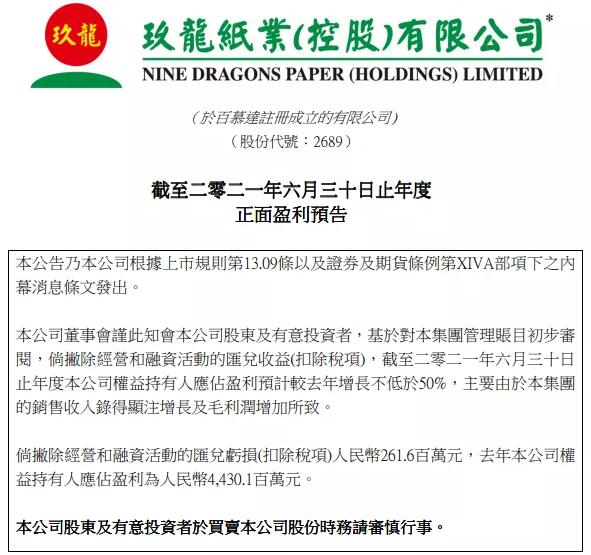 8月23日午間,玖龍紙業發布公告稱,基于對集團管理賬目初步審閱,倘撇除經營和融資活動的匯兌收益(扣除稅項),截至2021年6月30日止年度公司權益持有人應占盈利預計較截至2020年6月30日止年度增長不低于50%,主要由于集團的銷售收入錄得顯注增長及毛利潤增加所致。