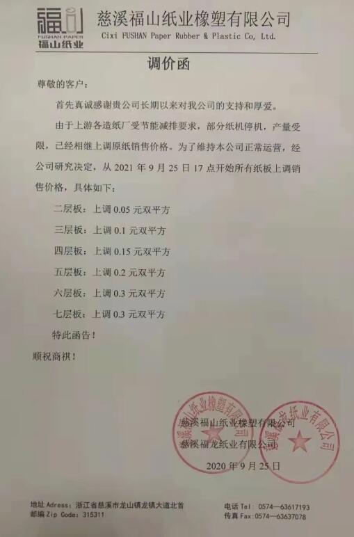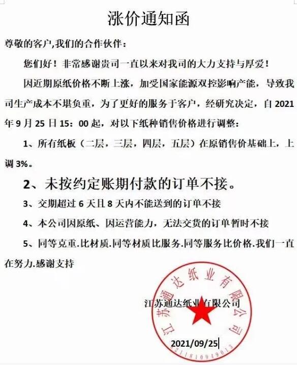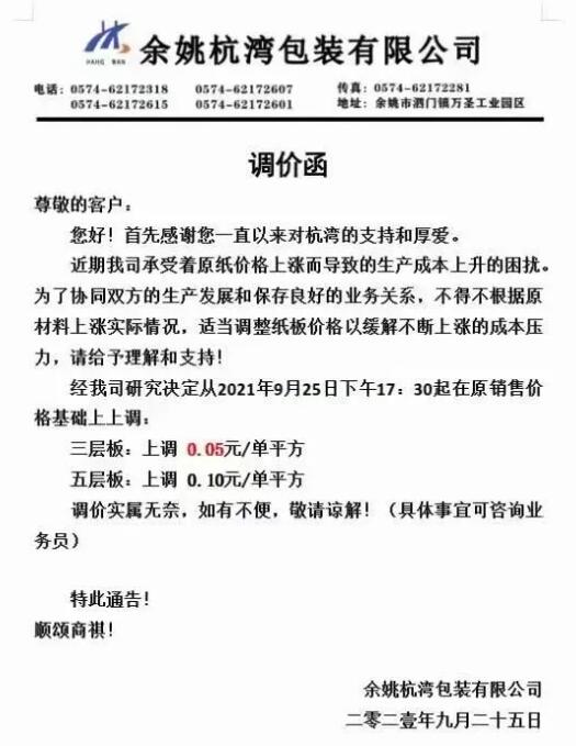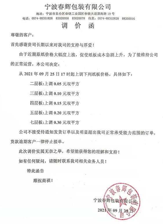 9月25日,寧波市大批紙板廠繼續跟進。慈溪福山、寧波春輝、文康包裝、新成包裝、和熙包裝…短短一個多小時內數家紙板廠發布漲價函,預計更多地區、更多工廠的漲價函也將在這兩天陸續發布。這場始于限電停機的漲價潮洶涌來臨!