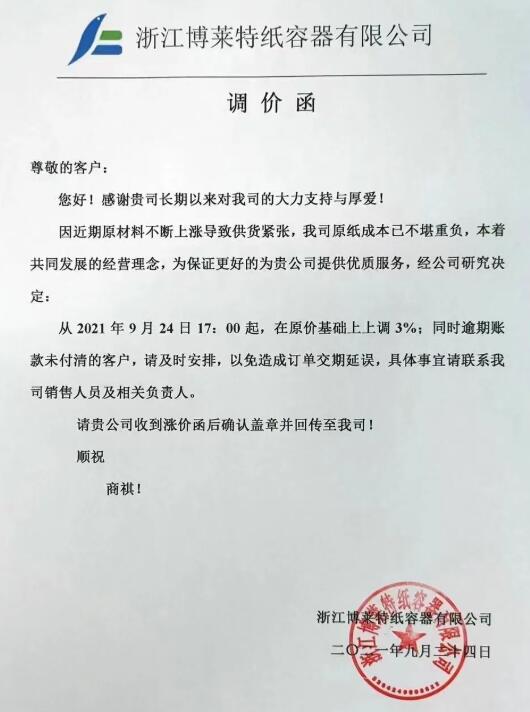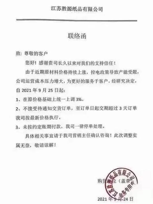 在“能耗雙控”的背景下,對造紙行業、包裝行業的影響不斷擴大,受到成本上漲與停機的影響,玖龍、山鷹及其它紙廠紛紛發布漲價函,國廢、原紙、紙板全面大面積上漲! 玖龍多個基地同時宣布今天原紙最高上調150元!其中東莞玖龍所有牛卡芯紙人民幣港幣漲100元,包括白面??ㄍ坎寂??。玖龍牌白板紙、海龍牌白板紙、地龍牌白板紙人民幣港幣漲100元,江龍牌白板紙漲150元。 沈陽基地:全系列牛皮紙、瓦楞紙在目前價格基礎上上調100元/噸。 江蘇太倉基地:全系列牛皮紙、瓦楞紙在目前價格基礎上上調100元/噸。 天津/河北基地:全系列牛皮紙、瓦楞紙在目前價格基礎上上調100元/噸。 重慶基地:全系列牛皮紙、瓦楞紙在目前價格基礎上上調100元/噸。 泉州玖龍紙業:???、再生紙取消優惠上調50-100元/噸,瓦楞紙上調紙價100元/噸。 另一家紙業巨頭山鷹紙業宣布,從9月25日開始,所有原紙上漲50-200/噸。從10月8日開始,所有原紙再上調200元/噸。 山東德派克紙業有限公司:近期因煤炭漲價、限電減產等造成公司經營成本壓力大,公司決定自2021年9月24日起,所有紗管紙銷售價在原基礎上統一上漲100元/噸。 秦皇島金茂源紙業有限公司:由于近期原材料不斷上漲,造成生產成本大幅增加,即日起我公司紗管紙銷售價格在原有基礎上上漲100元/噸。 中冶美利云產業投資股份有限公司:受國家節能減排政策及環保政策的影響,自9月26日起,將我司旗下所有彩色紙銷售價格在當前執行價格的基礎上上調300元/噸。 廣東理文造紙:??埐糠旨埛N價格上調50元/噸 聯盛紙業(龍海):除優質牛卡外,其它??埲∠麅灮?,上調紙價100元/噸,聯盛紙業(龍海)高強瓦楞紙上調紙價100元/噸 東莞金洲紙業:Q紙上調50,瓦楞紙上調紙價50元/噸 東莞銀洲紙業:箱板紙上調50元/噸 四川力天紙業:瓦楞紙價格上漲50元/噸 湖北金鳳凰紙業:高強瓦楞紙上調50元/噸 浙江華川紙業:高強瓦楞紙上調50元/噸 廣東中山永發紙業:70g及以下高強瓦楞紙上調100元/噸 浙江義烏義南紙業:高強瓦楞紙上調50元/噸 河南雅都紙業:瓦楞紙價格上調50元/噸 漳州盈晟紙業:高強瓦楞紙上調50元/噸 漳州友利達紙業:瓦楞紙上調100元/噸 江門市橋裕紙業:瓦楞紙上調50元/噸 四川成都迅源紙業:瓦楞紙上調50元/噸 成都迅源紙業:箱板紙上調50元/噸 山東豐源中科:瓦楞紙上調100元/噸 河南亨利紙業:高強瓦楞紙取消優惠 吉林長白山琦祥紙業:瓦楞紙上調50元/噸 原料漲價 中下游企業無奈跟漲 騰然而起的原料成本讓9月以來貼近成本線維持生產的紙板、紙箱廠大呼受不住,“保本生產”轉眼變成虧本生產。在越來越多的原紙漲價函包圍之下,紙板廠也選擇了跟進漲價。9月24日,浙江祥恒包裝有限公司、浙江博萊特紙容器有限公司發布漲價函,紙板價格上調3%。