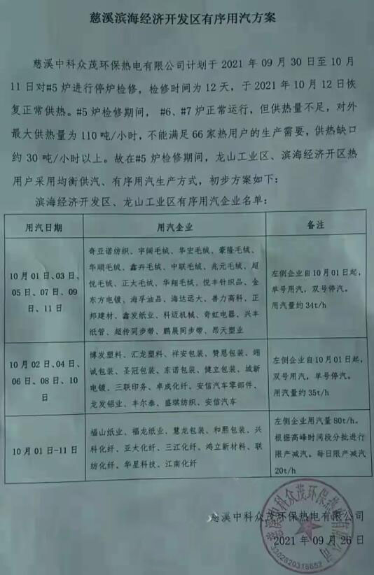 根據慈溪中科眾茂環(huán)保熱電有限公司于9月26日發(fā)布的《慈溪濱海經濟開發(fā)區(qū)有序用汽方案》顯示,該熱電公司計劃于9月30日至10月11日對#5爐進行停爐檢修,檢修時間為12天,在此期間,龍山工業(yè)區(qū)、濱海經濟開發(fā)區(qū)熱電用戶采用均衡供汽、有序用汽生產方式。