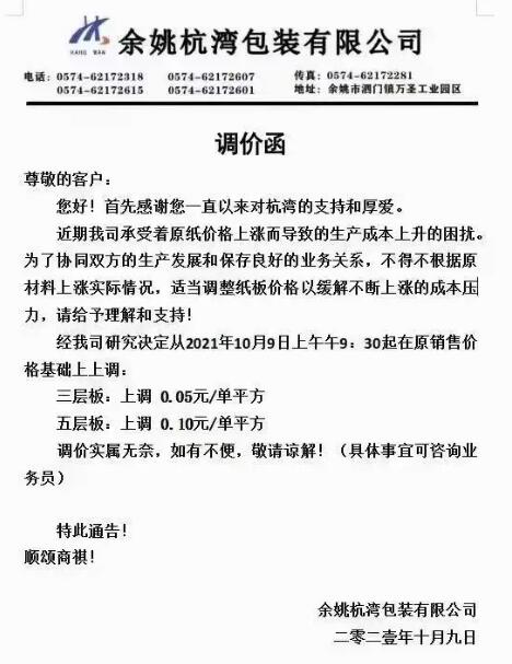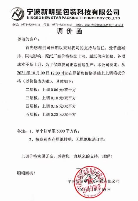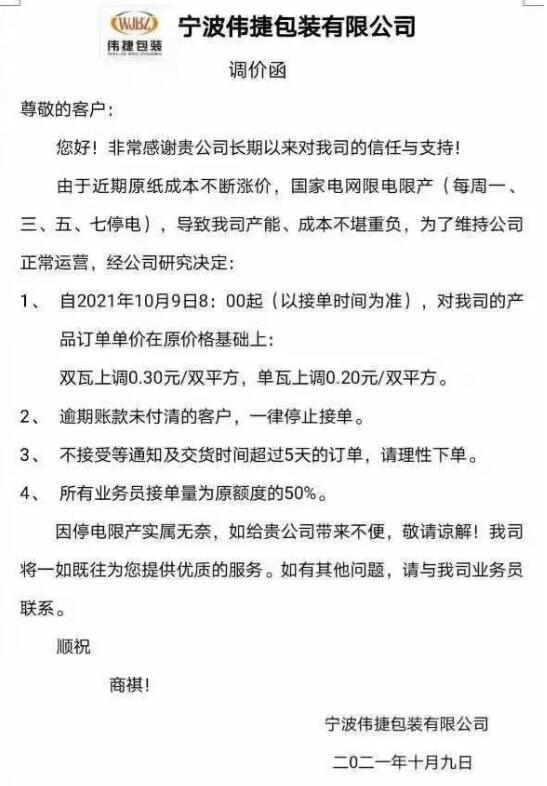 和前3輪漲價不一樣的是,這一次漲價函在上午就被早早發出,新價格最早在今天8點即執行。此外,根據紙箱廠收到的消息,受限電停產影響,該地區紙板廠被執行“開四停三”政策,接下來可能面臨漲價也拿不到貨的情況。