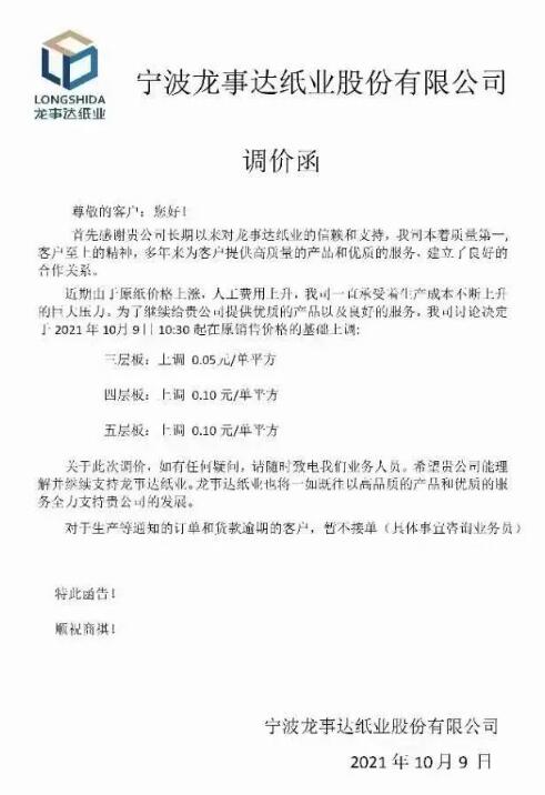 9月25日,浙江寧波紙板廠集體漲價,一天之內近30家企業發布漲價函,周邊城市迅速響應;同時,玖龍四大基地宣布國慶后(10月9日)原紙再漲100元/噸;山鷹10月8日起所有包裝紙價格上調200元/噸。