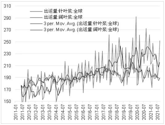 2019年開始,全球針葉漿出運量緩慢下降,而我國針葉漿進(jìn)口量占全球出運量的比重相對穩(wěn)定。可以看出,第一,我國沒有額外的資源爭奪;第二,我國的針葉漿供應(yīng)基本跟隨全球市場。根據(jù)前述對出運量的判斷,2022年年初國內(nèi)針葉漿進(jìn)口量將增加,但從全年角度來說,依舊保持平穩(wěn)狀態(tài)。