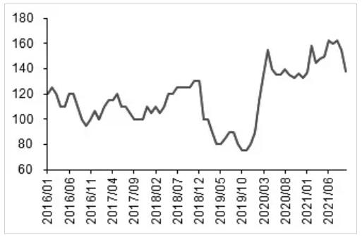 第二,針葉漿庫存水平達(dá)到高位。截至2021年9月,全球針葉漿廠家?guī)齑嫣鞌?shù)已到45天,為有數(shù)據(jù)記錄的10年來的最高水平。漿廠去庫迫在眉睫,且去庫壓力的釋放一定會伴隨出運量的階段性增加。從2020年8月類似的情況看,針葉漿可能出現(xiàn)3—6個月的出運量邊際走高。可以預(yù)計,2022年年初針葉漿的供應(yīng)勢必放量。