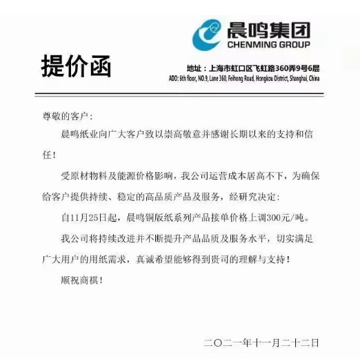 晨鳴集團:11月25日起,我公司白卡、銅版卡產品漲價300元/噸。