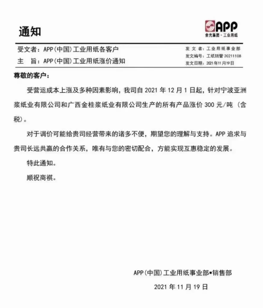 APP工業用紙:我司自2021年12月1日起,針對寧波亞洲漿紙業有限公司和廣西金桂漿紙業有限公司生產的所有產品漲價300元/噸(含稅)。
