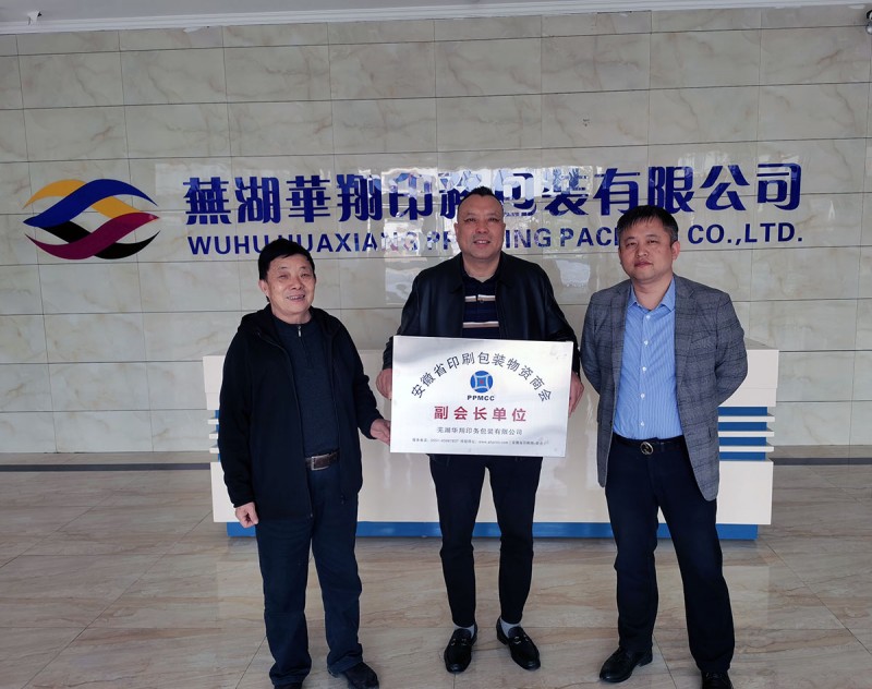 瞿風雷會長和李新江常務副會長 給新入會的周必森副會長授牌 下午,瞿風雷會長、李新江常務副會長、王康紅副會長、楊軍副秘書長又在蕪湖華翔印務包裝有限公司董事長劉武的帶領下,蒞臨蕪湖華翔印務包裝有限公司,參觀了該公司新上的兩臺BHS瓦楞生產線,并在VIP貴賓接待室進行了深入交流。同時,瞿風雷會長和李新江常務副會長也給蕪湖華翔印務包裝有限公司董事長劉武頒發了證牌!