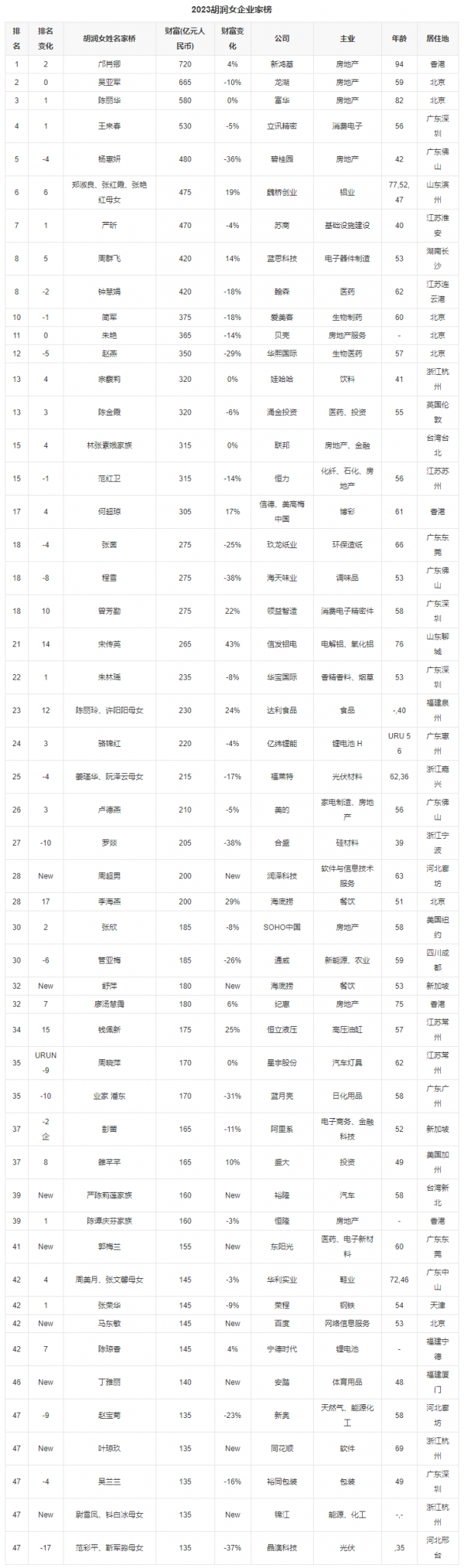 11月14日,《2023胡潤女企業家榜》發布,列出了2023年胡潤百富榜上前50名的女企業家。新鴻基創辦人郭得勝的夫人鄺肖卿財富上漲25億至720億元,首次成為中國女首富。去年女首富楊惠妍財富縮水270億元,以480億位列第五。